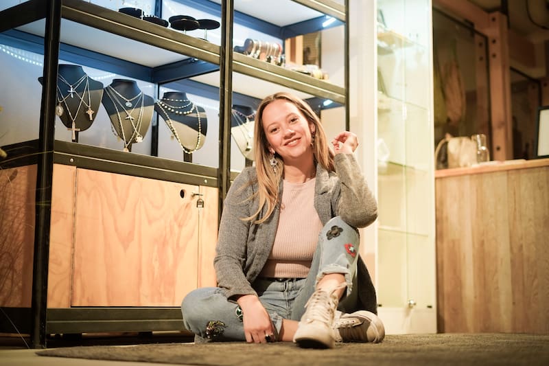 Ingrid, de antemano, aclara que prefiere que le digan “Peka”, su apodo desde cabra chica; su nombre, en cambio, lo siente demasiado formal. Antes de tomarse las fotos que acompañan esta entrevista con La Cuarta, la orfebre pide unos segundos para echarse una manito de gato con una brochita frente al espejo de tienda. Se cambia de de aritos: “Estos me los regaló la Paty Cofré”, comenta mientra se los saca y se pone unos que ella hizo, y se prueba un elegante tocado con piedritas verdes.