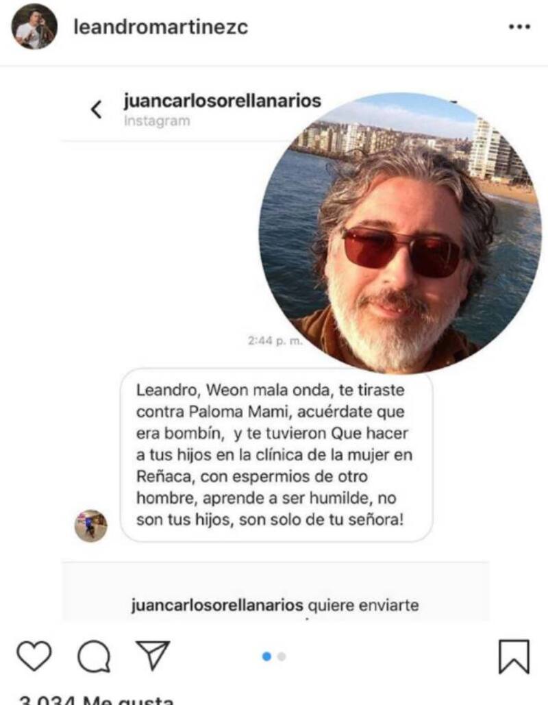 "Weón mala onda, te tiraste contra Paloma Mami, acuérdate que era bombín (sic), y te tuvieron que hacer a tus hijos en la clínica de la mujer en Reñaca, con espermios de otro hombre, aprende a ser hmuilde, no son yus hijos, son solo de tu señora!", fue el feo posteo que recibió en Instagram, donde le recordaron que se transformó en padre de tres trillizas mediante la fertilización in vitro.