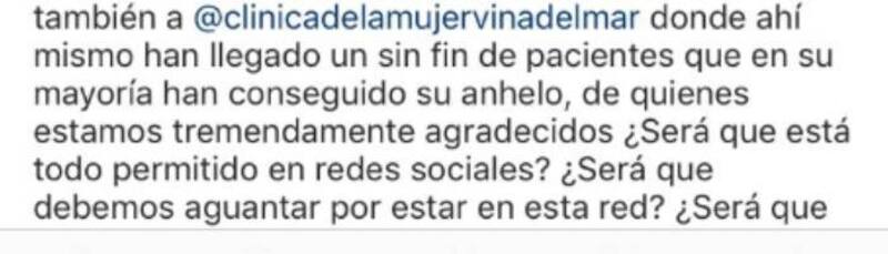 Además, sostuvo que el usuario "se refiere a lo más sagrado que tengo, mi familia, a un proceso que vivimos con mi esposa que hoy recordamos como hermoso, proceso que hicimos público e inspiramos a muchos a seguir luchando por el sueño de ser padres, donde hemos recibido un sin fin de mensajes que muchos han logrado serlo y que fuimos un impulso. No me arrepiento ni me arrepentiré nunca de haberlo hablado públicamente porque demostramos que se puede cuando muchos bajan los brazos, alude también a @clinicadelamujervinadelmar donde ahí mismo han llegado un sin fin de pacientes que en su mayoría han conseguido su anhelo, de quienes estamos tremendamente agradecidos".