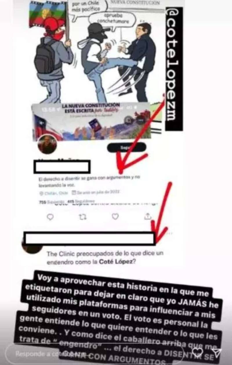 “Voy a aprovechar esta historia en la que me etiquetaron para dejar en claro que yo jamás he utilizado mis plataformas para influenciar a mis seguidores en un voto”, aclaró de una. Esto, en alusión al Plebiscito de Salida por una nueva Constitución que se realizará el próximo 4 de septiembre.