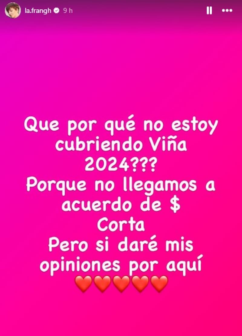 “¿Por qué no estoy cubriendo Viña 2024? Porque no llegamos a un acuerdo de $. Corta”, sentenció Fran.