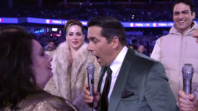 El animador se inclinó sobre ella, notoriamente incómoda, y le puso el micrófono.
