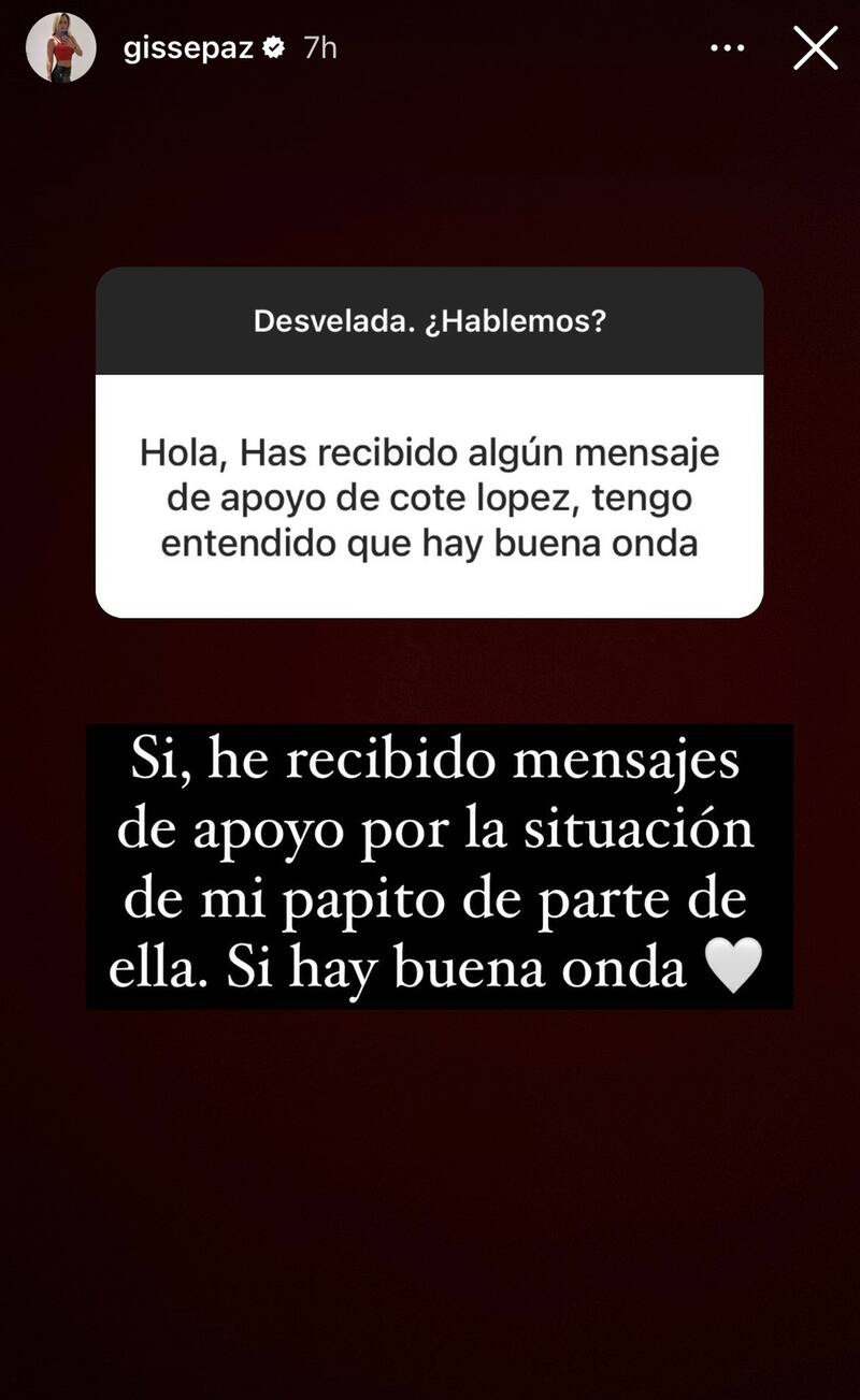 Eso sí, hubo una inesperada pregunta que le llegó y que decidió responder. En concreto, un usuario le consultó si Cote López, con quien tuvo una polémica de aquellas hace un par de años producto del vínculo que tuvo esta última con Mauricio Pinilla en el recordado episodio del “Rey León”, le había enviado algún mensaje relacionado con el momento de su progenitor.