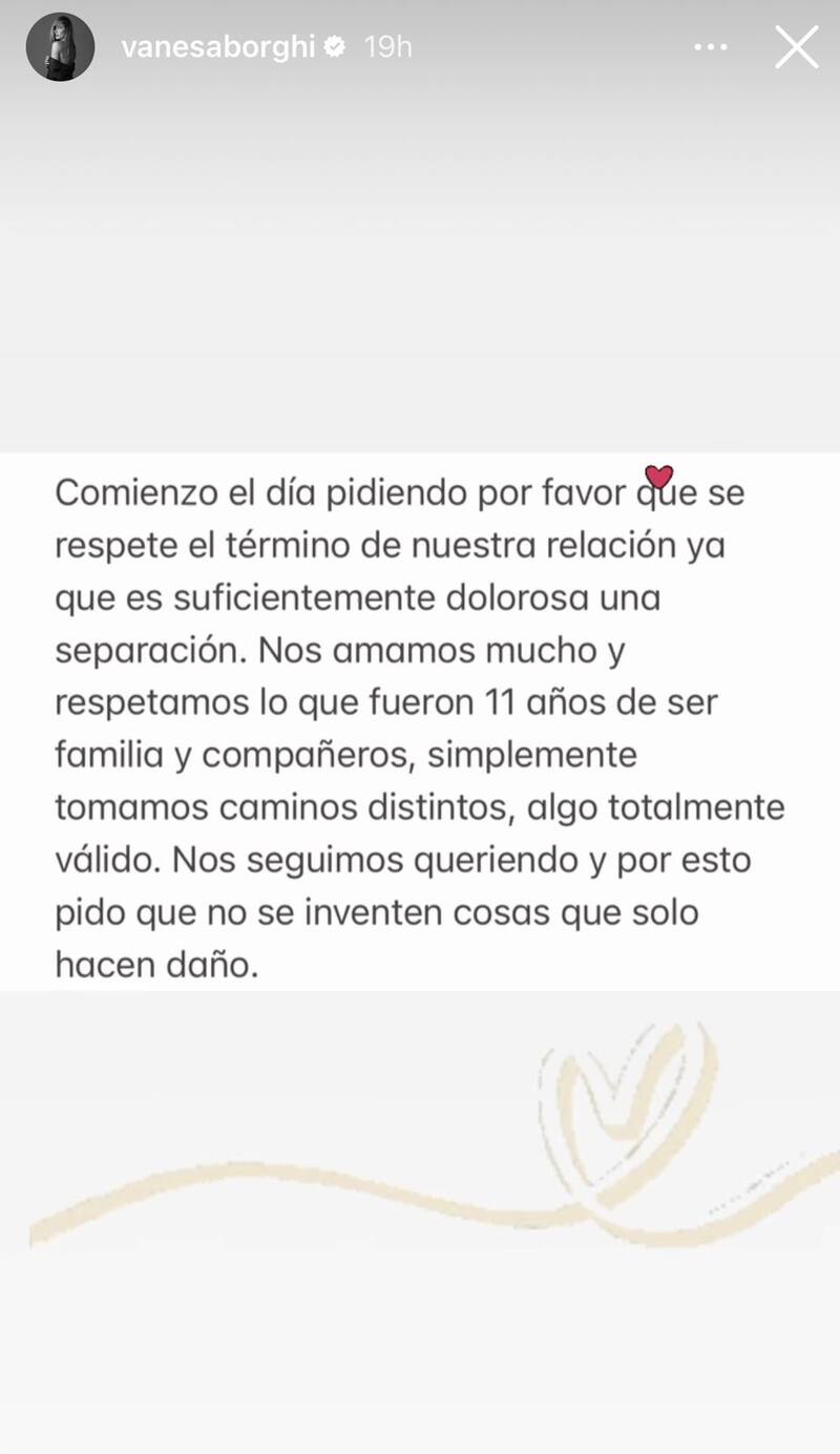 “Comienzo el día pidiendo por favor que se respete el término de nuestra relación, ya que es suficientemente dolorosa una separación”, escribió de entrada en el formato de historias.