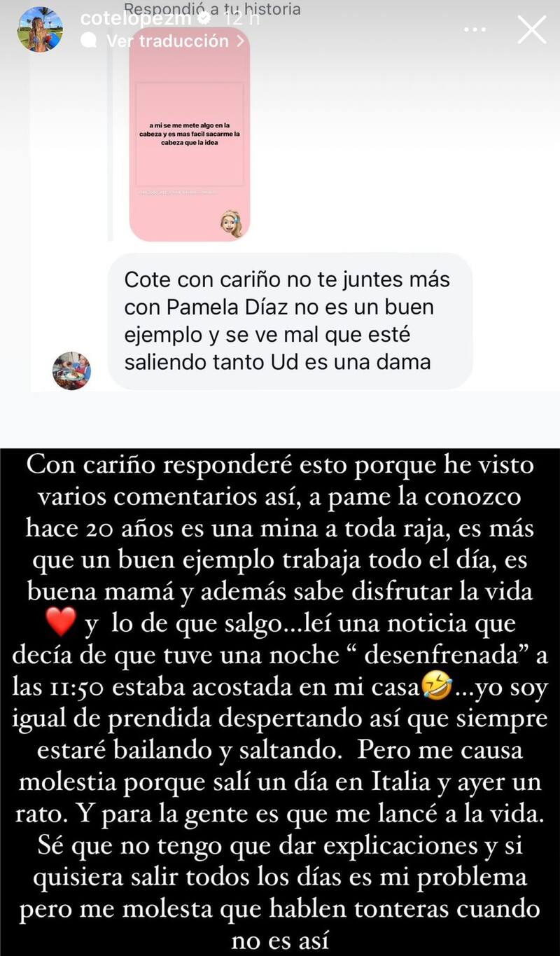 “Cote, con cariño, no te juntes más con Pamela Díaz. No es un buen ejemplo y se ve mal que esté saliendo tanto con usted (que) es una dama”, le escribieron a emprendedora.