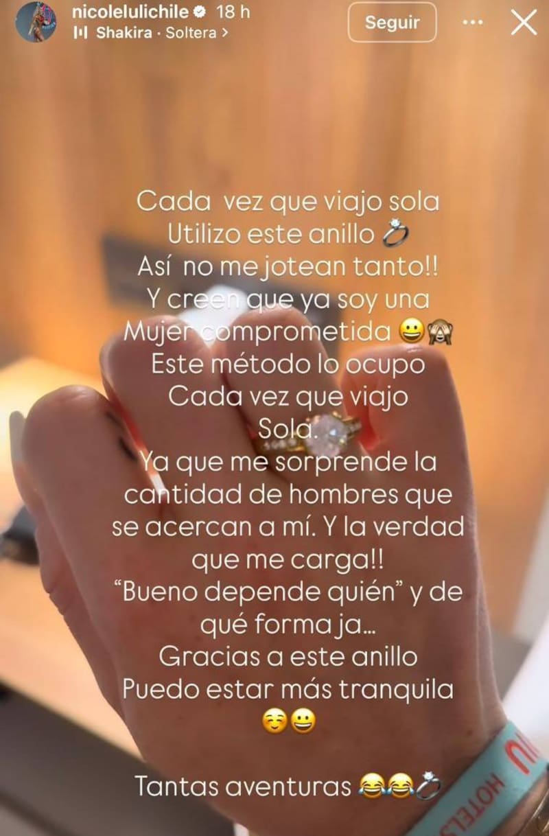 “Cada vez que viajo sola utilizo este anillo, así no me jotean tanto”, explicó Luli en la publicación.