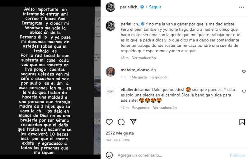 “A esas personas tan m… en la vida que tratan de hacerle una maldad a una persona que trabaja, madre de 3 hijos que se saca la ch… los dejo en manos de Dios. No es una brujería por ser gitana, recuerden que el daño que tratan de hacerme se les devolverá 10 veces más porque el karma existe y agradezco a todas las personas que me siguen”, añadió Perla Ilich.