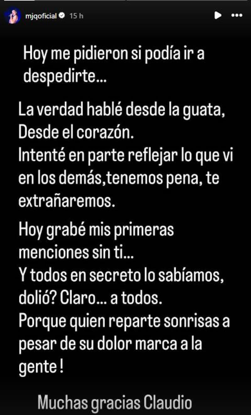 “Hoy grabé mis primeras menciones sin ti. Y todos en secreto lo sabíamos... ¿dolió? claro... a todos. Porque quien reparte sonrisas a pesar de su dolor, marca a la gente. Muchas gracias, Claudio", finalizó.