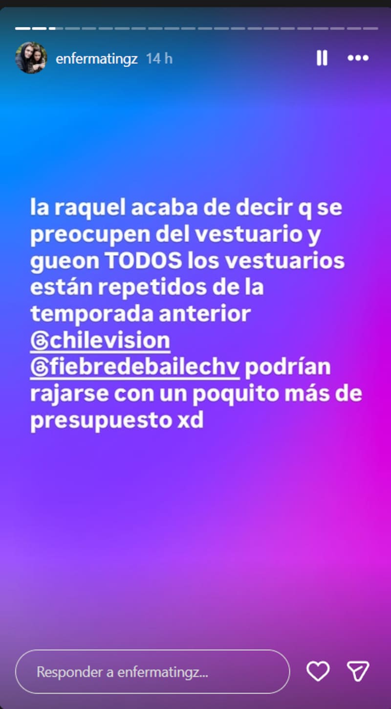 “La Raquel (Argandoña) acaba de decir que se preocupen del vestuario y gueón (sic), todo el vestuario está repetido de la temporada anterior... Podrían rajarse con un poquito más de presupuesto”, escribió en sus stories.