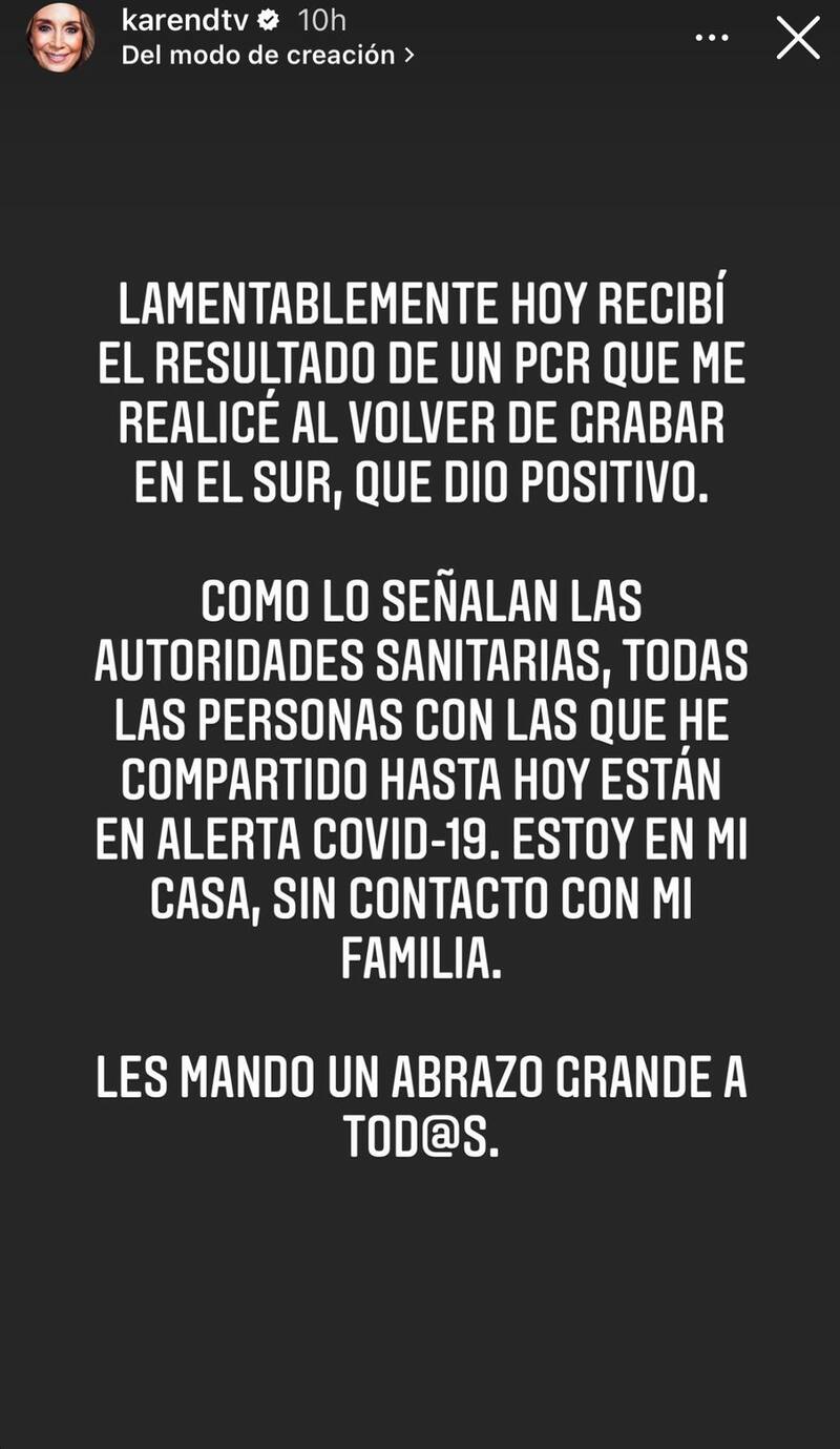 Por último, afirmó que se encuentra aislada en su hogar. “Estoy en mi casa, sin contacto con mi familia. Les mando un abrazo grande a tod@s”, remató.