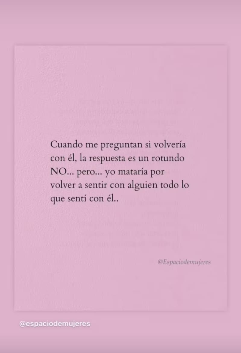 “Cuando me preguntan si volvería con él, la respuesta es un rotundo no… pero yo mataría por volver a sentir con alguien todo lo que sentí con él”, añadió en sus historias.
