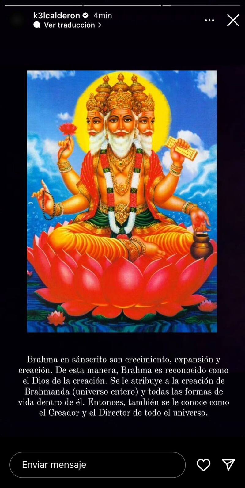 “Brahma en sánscrito son crecimiento, expansión y creación. De esta manera, Brahma es reconocido como el Dios de la creación. Se le atribuye a la creación de Brahmanda (universo entero) y todas las formas de vida dentro de él. Entonces, también se le conoce como el Creador y el Director de todo el universo”.