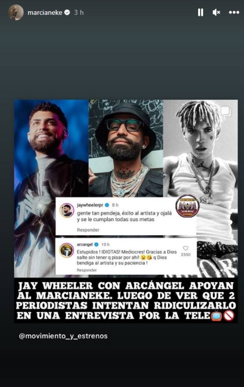 El músico urbano también compartió la cerrada defensa que expresaron dos de sus colegas: “Gente tan pendeja”, lanzó Jay Wheeler. Mientras que Arcangel fue aún más duro: “¡Estúpidos, idiotas, mediocres! Gracias a Dios salté sin tener que pisar por ahí”.