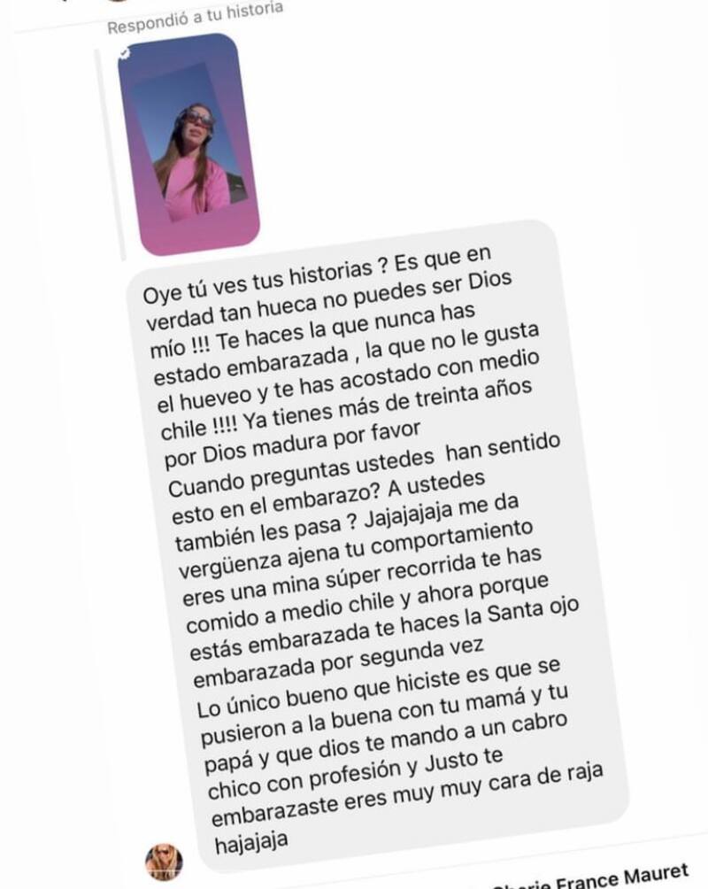 Tras esto, compartió un mensaje que le envió la mujer, en donde la insultaba por su embarazo y su comportamiento en redes. “Te haces la que nunca ha estado embarazada, la que no le gusta el huev… y te has acostado con medio Chile”, fue parte del texto que le envió la mujer a Vale por DM.