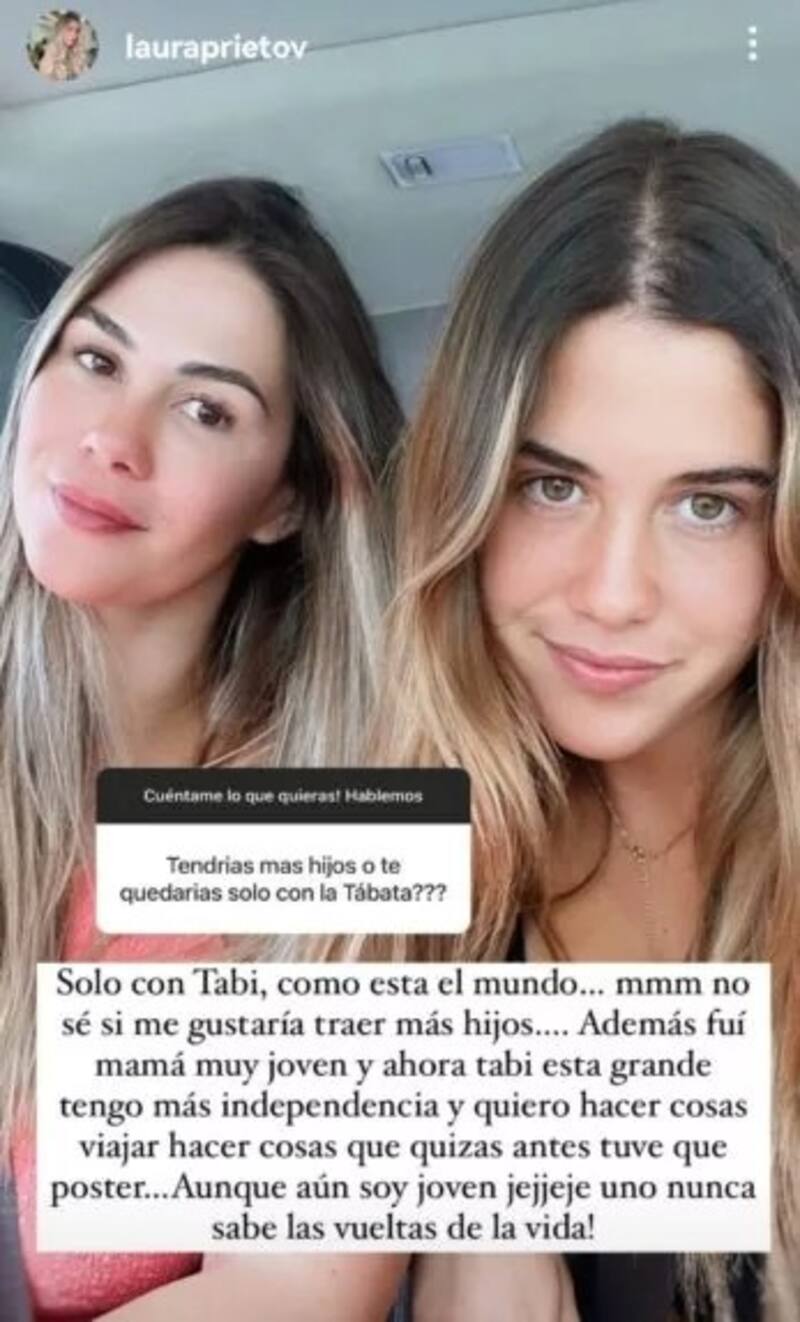 “Solo con Tabi, como está el mundo. Mmmm, no sé si me gustaría traer más hijos. Además fui mamá muy joven y ahora Tabi está grande”, indicó Laura Prieto al referirse a su actual rol como madre presumiendo una encantadora foto al momento de responder dicha pregunta.