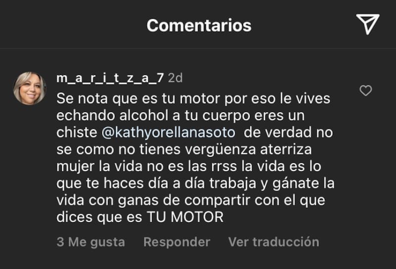 “Se nota que es tu motor, por eso le vives echando alcohol a tu cuerpo. Eres un chiste, de verdad, no sé como no tienes vergüenza. Aterriza, mujer. La vida no es las redes sociales, es lo que te haces día a día, trabaja y ganate la vida con ganas de compartir con él qué dices que es tu motor”, fue el duro mensaje que le dejaron.
