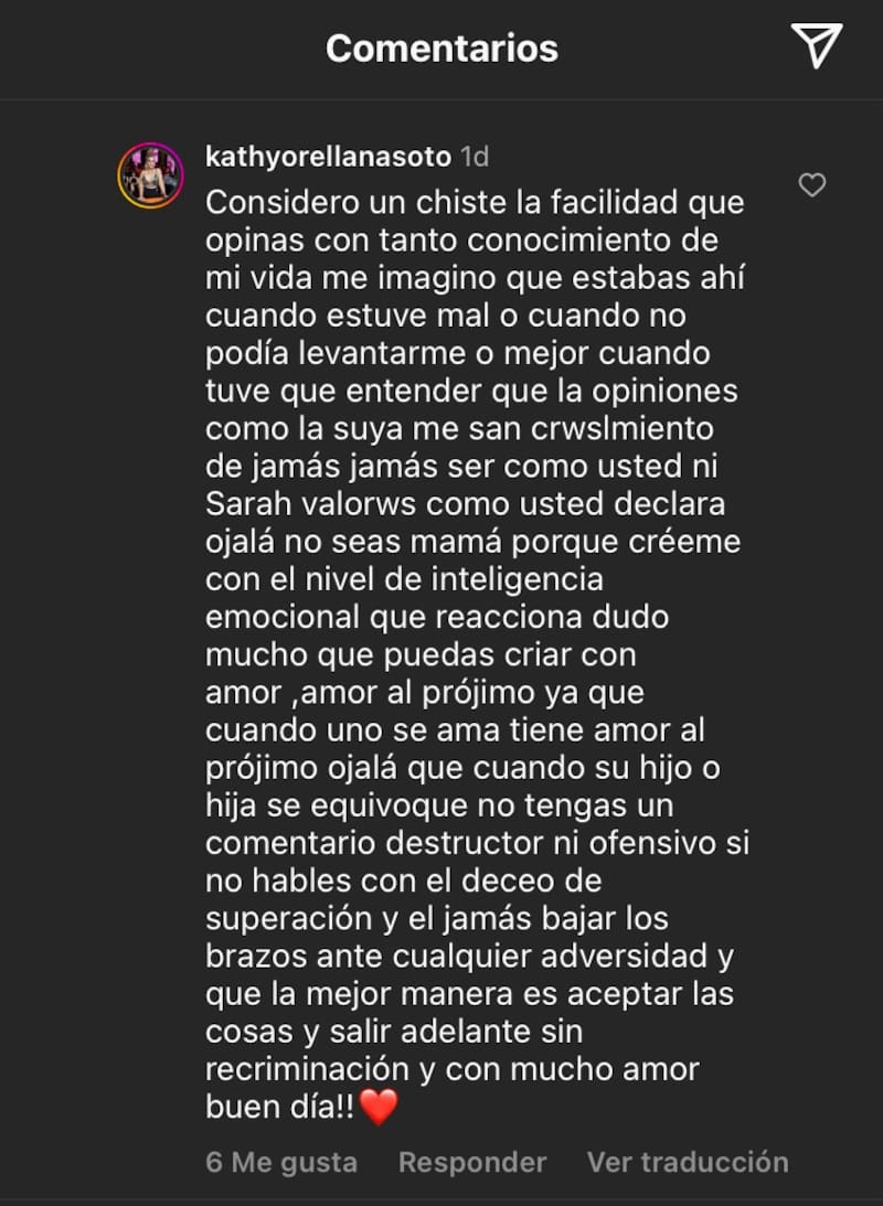Kathy Orellana respondió a usuaria que le dejó una ácida crítica en una tierna publicación que compartió en su cuenta de Instagram.