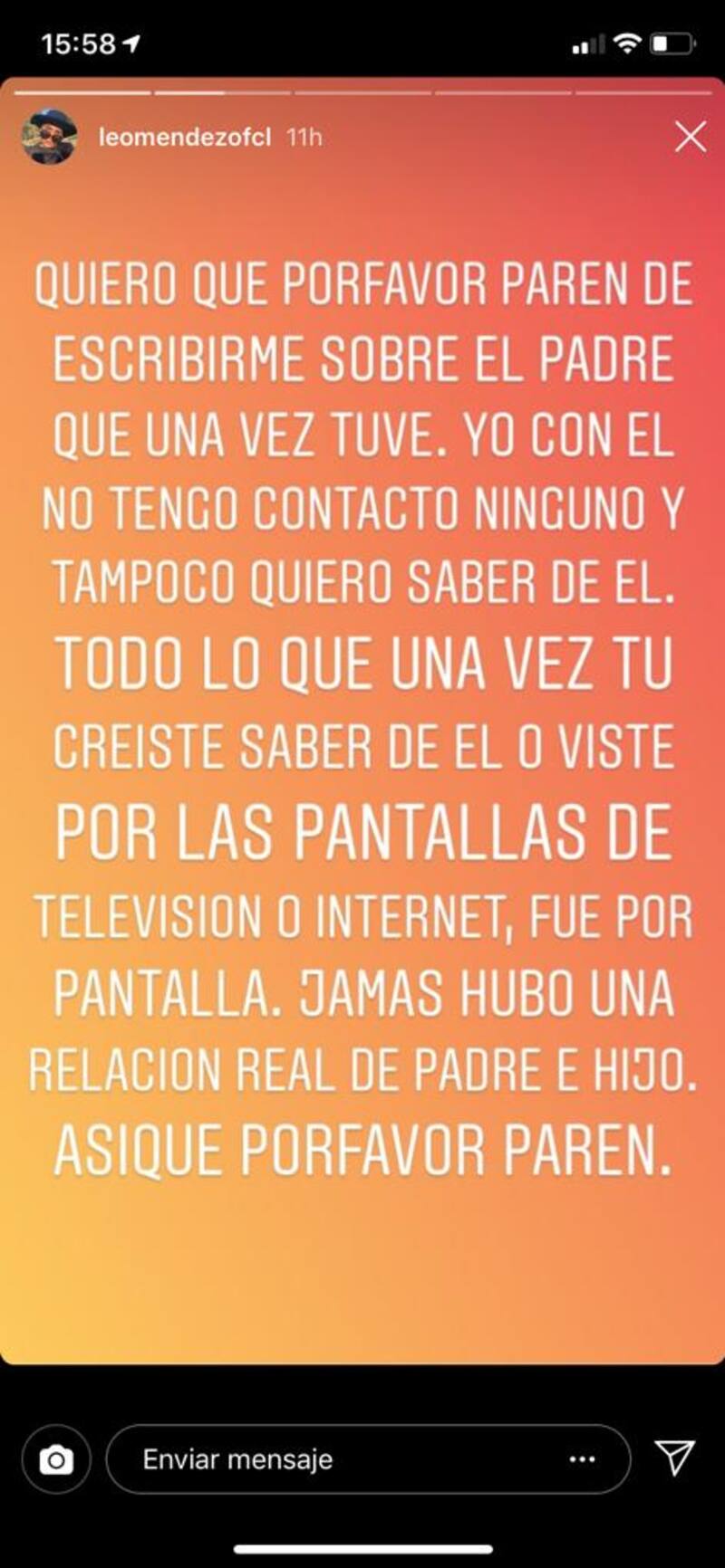 "Quiero que por favor paren de escribirme sobre el padre que una vez tuve. Yo con él no tengo contacto ninguno. Y tampoco quiero saber de él", comenzó escribiendo.