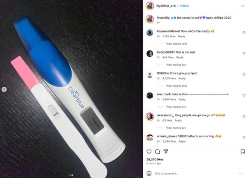 Phillips subió un video y compartió una foto, posó acariciando su abultada panza y con una sonrisa en sus labios. Además, publicó una imagen del test de embarazo con el resultado positivo de una o dos semanas.