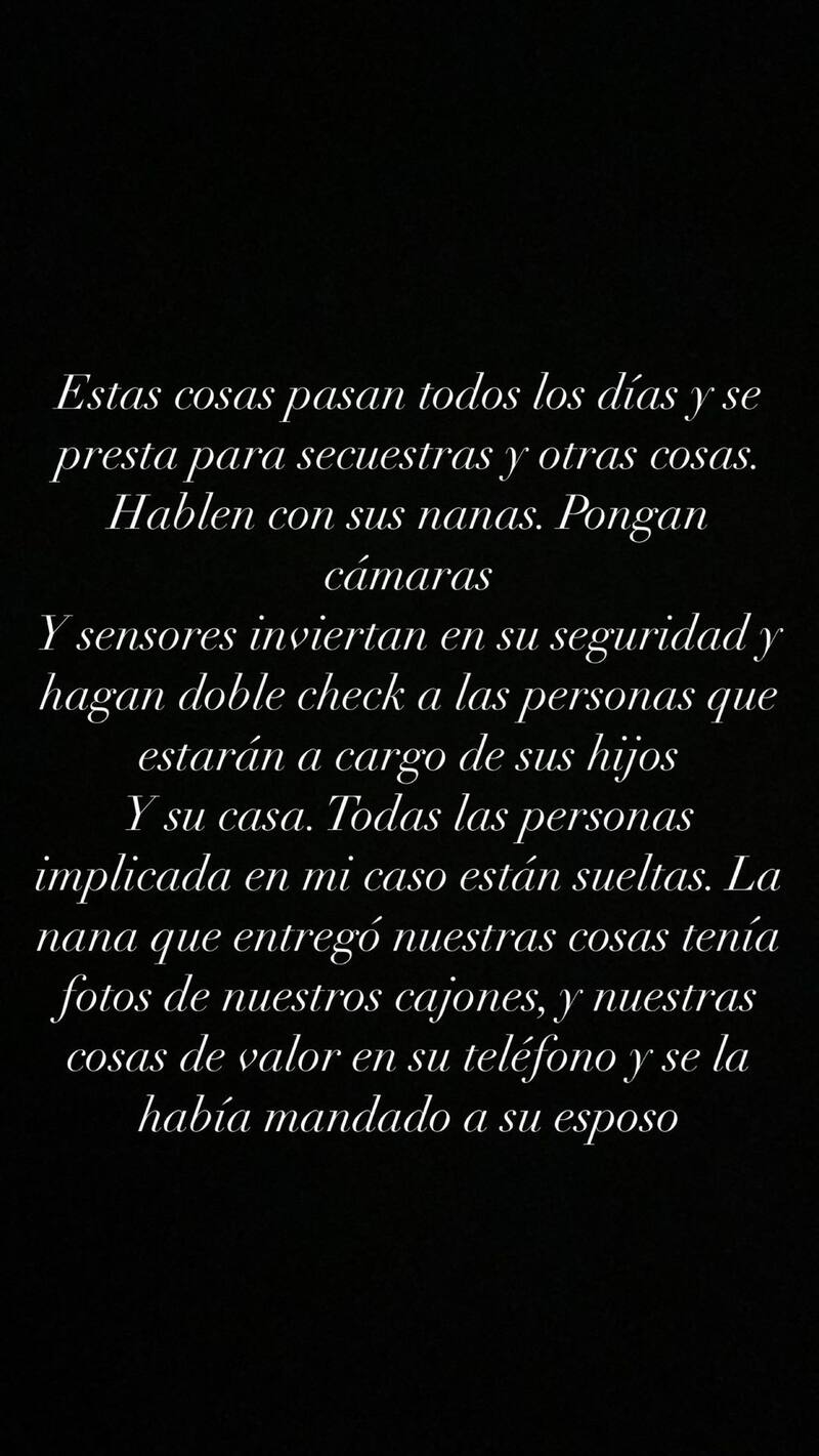 A través de su cuenta en Instagram, la modelo entregó detalles de lo ocurrido. En las publicaciones acusó que estaría involucrada la persona que cuidaba a su retoño.