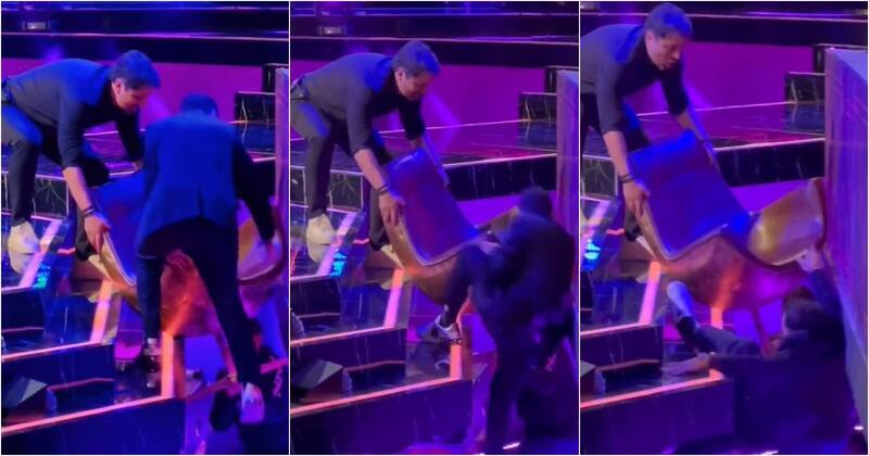 Tras ponerse de pie, Karol fue en busca de su silla que quedó atascada entre los escalones que eran parte de la escenografía. Sin embargo, no calculó bien y terminó cayéndose del escenario.