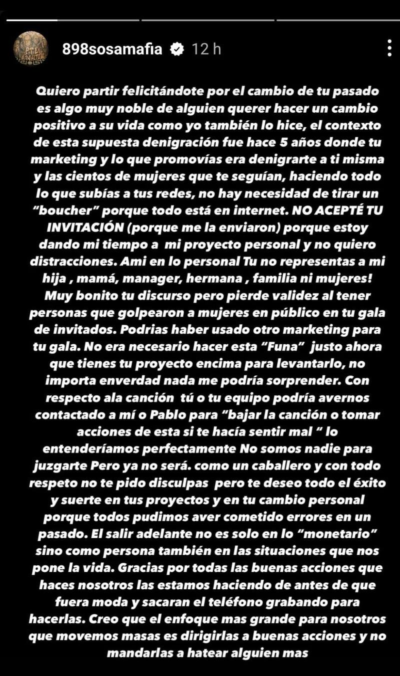 También vía redes, el Sosamafia se pronunció: “Quiero partir felicitándote por el cambio de tu pasado, es un acto muy noble querer hacer un cambio positivo en su vida, como yo”, inició.