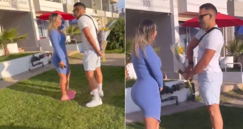 Luego de acceder a un par de fotos en el exterior de hotel donde se hospedaba, la influencer fue sorprendida por un galán que se le acercó con un ramo de flores.