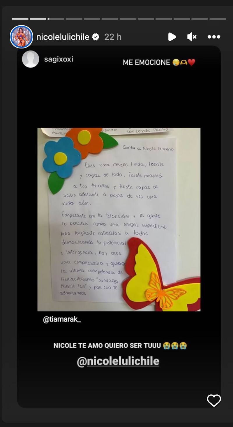 A través de sus historias en la popular red social, Nicole Moreno agradeció el tierno gesto y escribió: “me emocioné”.