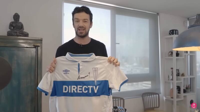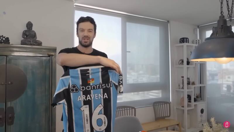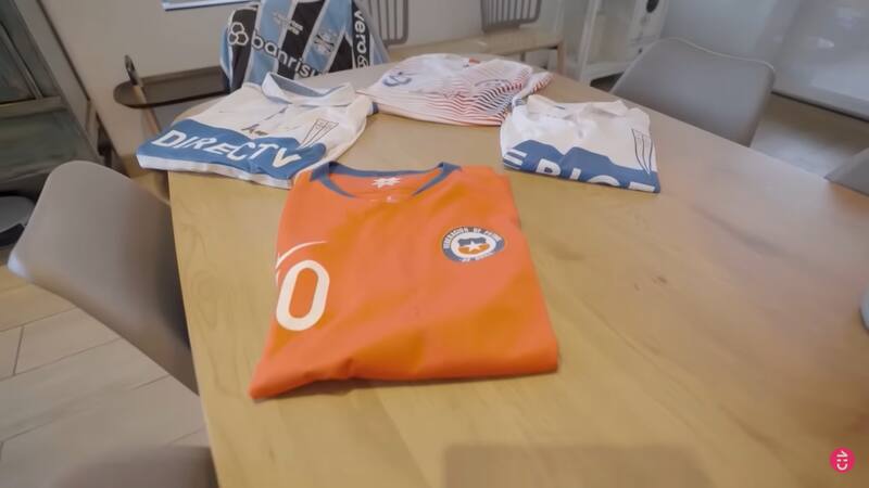 “Tengo aquí una parte de una gran colección de camisetas que tengo yo de un alumno muy querido que es Alexander Aravena, que juega ahora en el Gremio de Brasil y es seleccionado chileno”, detalló.
