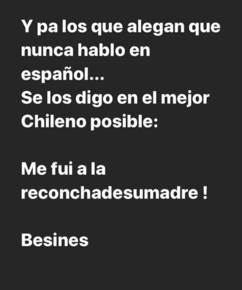 "Para los que alegan que nunca hablo en español… Se los digo en el mejor chileno posible: Me fui a la reconchadesumadre!… Besines".