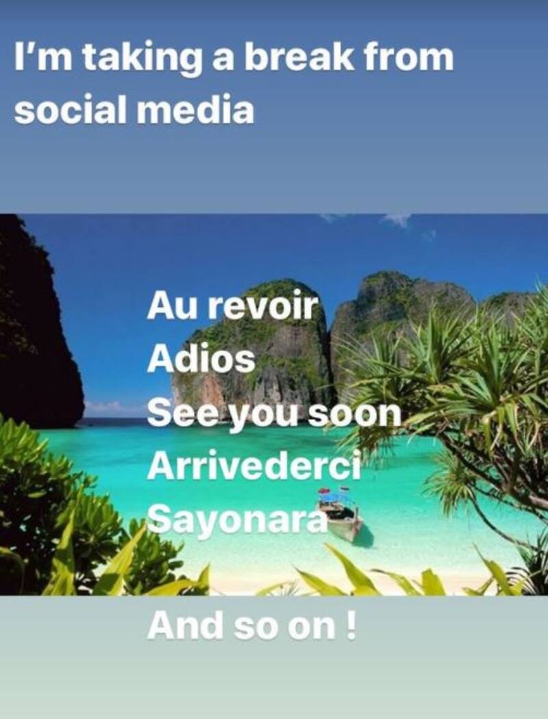 En la primera imagen, escribió en inglés "Hola, me voy a tomar un descanso" y, un poco más abajo, se despidió de sus seguidores escribiendo "Adiós" en distintos idiomas: francés, español, inglés, italiano y japonés.