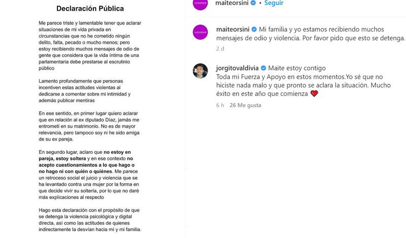 La inesperada muestra de apoyo fue publicada en la cuenta de Instagram de la diputada, específicamente en su última y comentada publicación: una extensa declaración pública donde denuncia amenazantes mensajes.