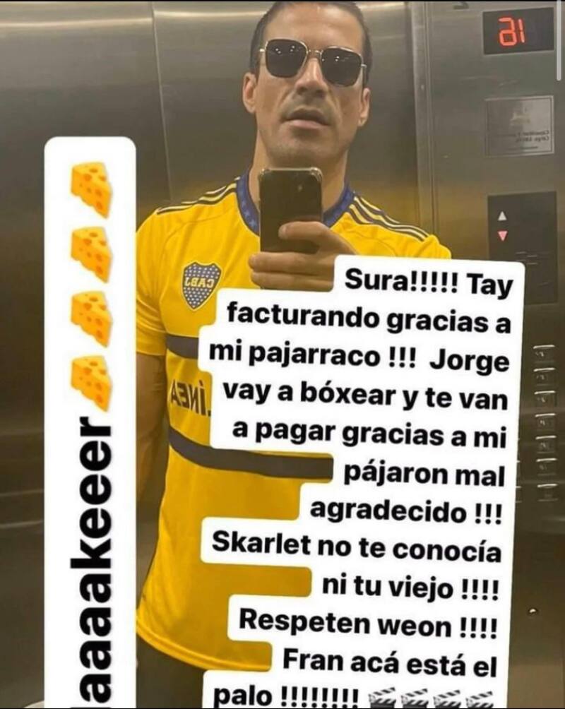 “Sura, estas facturando gracias a mi, pajarraco. Jorge, vas a boxear y te van a pagar gracias a mí, pajarón mal agradecido. Skarlet, no te conocía ni tu viejo. Fran, acá está el palo”, escribió Sebastián Ramírez.