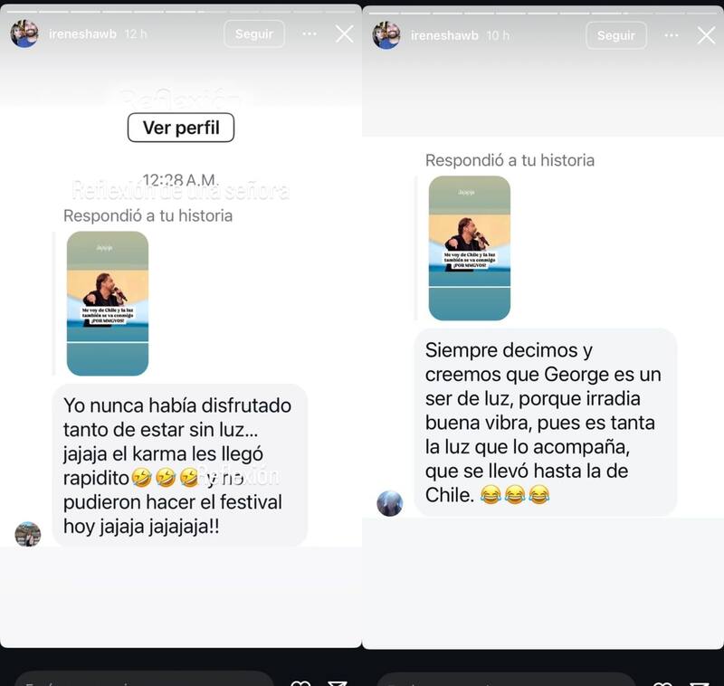 Desde la cuenta de Instagram @ireneshawb -la cual sería de la mamá del humorista venezolano según informaron en Contigo en la mañana- la mujer compartió varios memes respecto al apagón que afectó a Chile la jornada del 25 de febrero.
