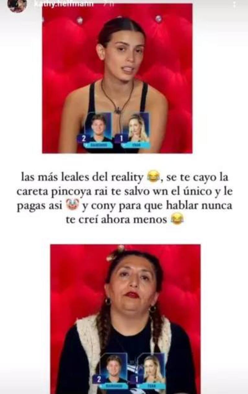 “Las más leales del reality. Se te cayó la careta Pincoya. Rai te salvo hueón, el único y le pagas así, y Cony para qué hablar, nunca te creí, ahora menos”, escribió la mujer en sus historias de Instagram, según consigna Página 7.