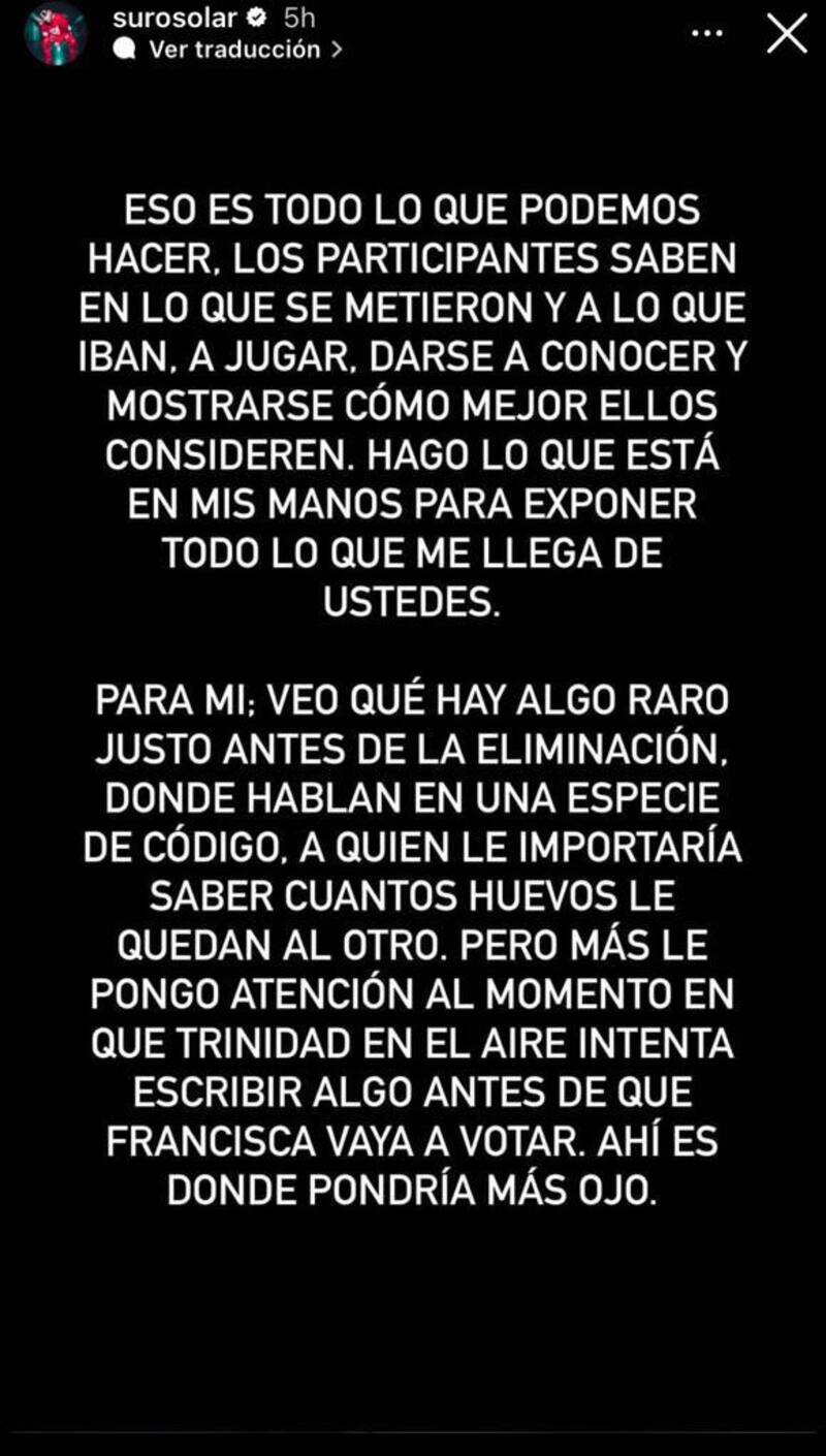 “Eso es todo lo que podemos hacer, los participantes saben en lo que se metieron y lo que iban: a jugar, darse a conocer y mostrarse como mejor ellos consideren. Hago lo que está en mis manos para exponer todo lo que ustedes me hacen llegar”, sentenció Solar.