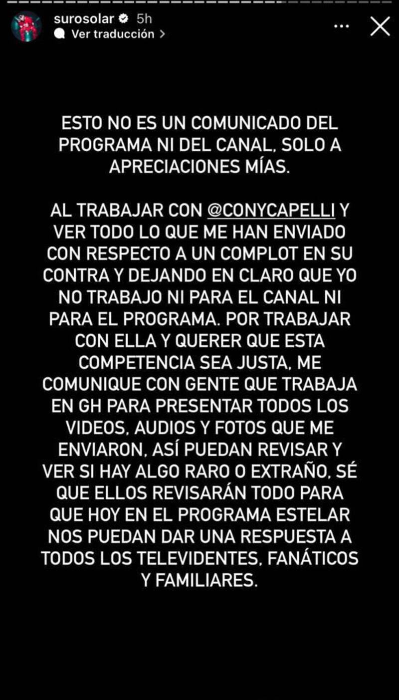 “Al trabajar con @Conycapelli y ver todo lo que me han enviado con respecto a un completo en su contra y dejando en claro que yo no trabajo ni para el canal, ni para el programa. Por trabajar con ella y querer que esta competencia sea justa, me comuniqué con gente que trabaja en Gran Hermano para presentar todos los videos, audios y fotos que me enviaron”, comenzó diciendo.