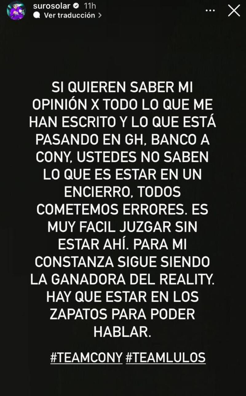 “Todos cometemos errores, es muy fácil juzgar sin estar ahí. Para mí Constanza sigue siendo la ganadora del reality. Hay que estar en los zapatos para poder hablar”, sentenció en la storie que compartió en Instagram.