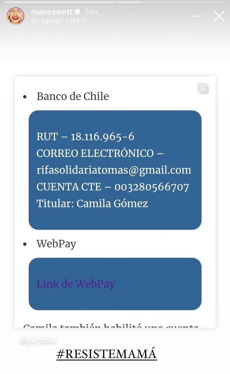 Swett compartió una fotografía de Camila Gómez con el hashtag “Resiste mamá”, además de los datos de la cuenta corriente donde se está juntando el dinero que necesita el menor para un tratamiento médico para la distrofia muscular de Duchenne que padece.
