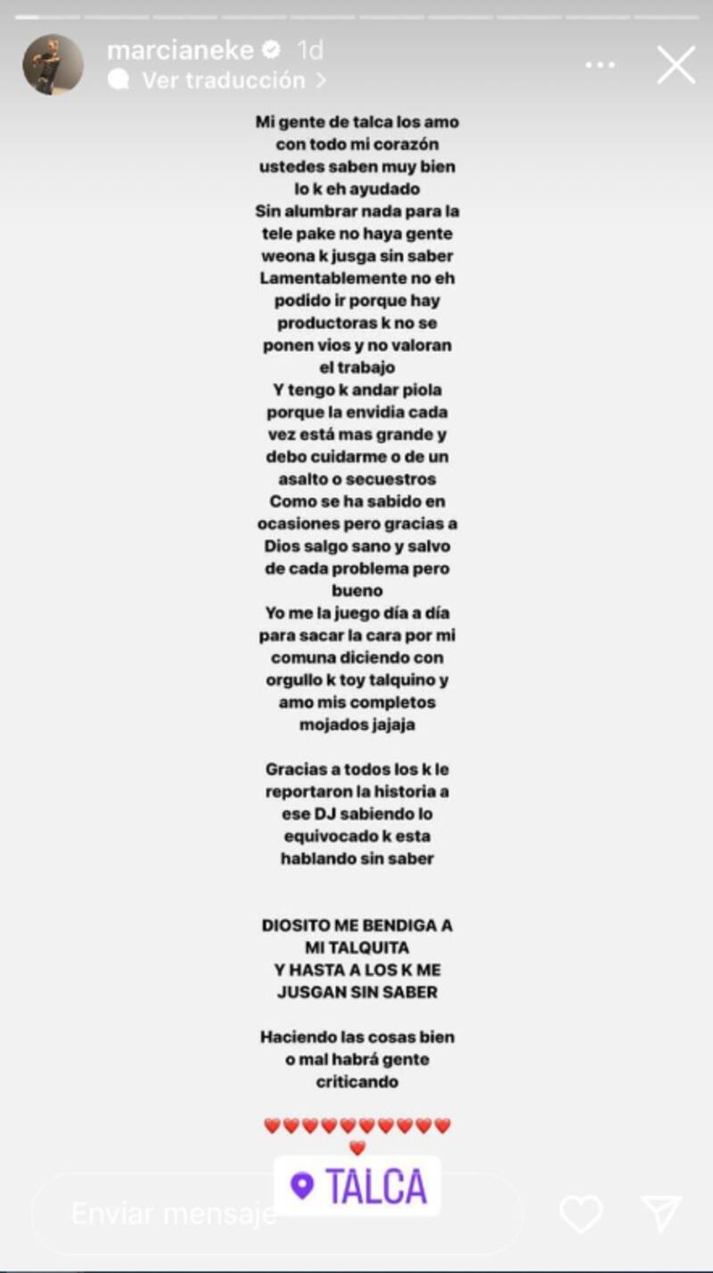 “Yo me la juego día a día para sacar la cara por mi comuna, diciendo con orgullo que soy talquino y amo mis completos mojados. Gracias a todos los que le reportaron la a ese DJ sabiendo lo equivocado que está hablando sin saber”, afirmó.
