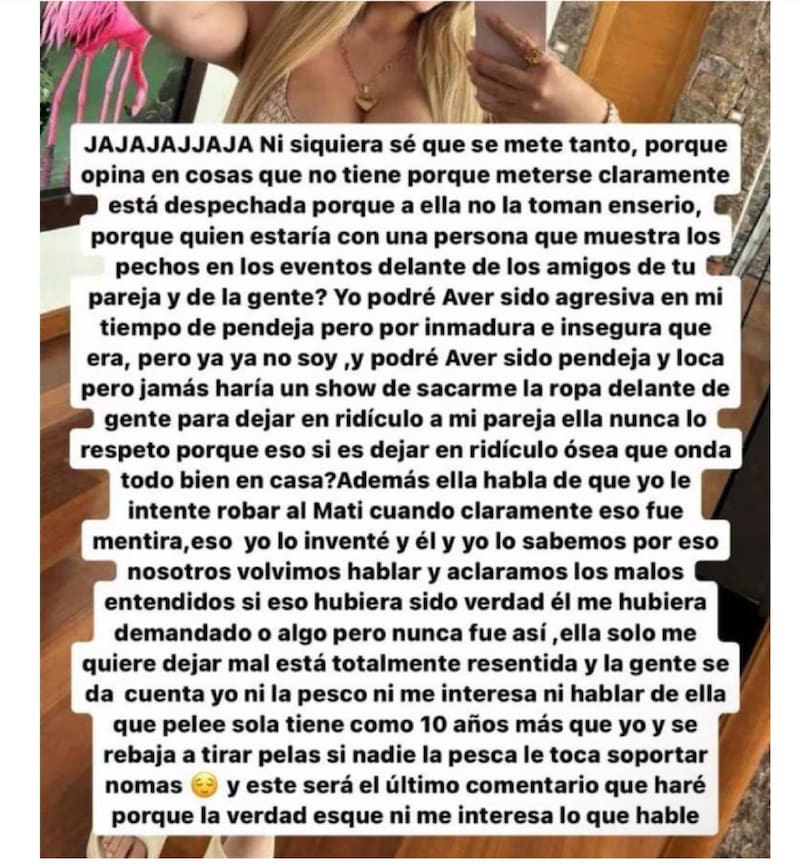También respondió a la acusación de robo, pero dice que no es verdad. “Ella habla de que yo le intente robar al Mati cuando claramente eso fue mentira, eso yo lo inventé y él y yo lo sabemos por eso nosotros volvimos hablar y aclaramos los malos entendidos”, dijo.