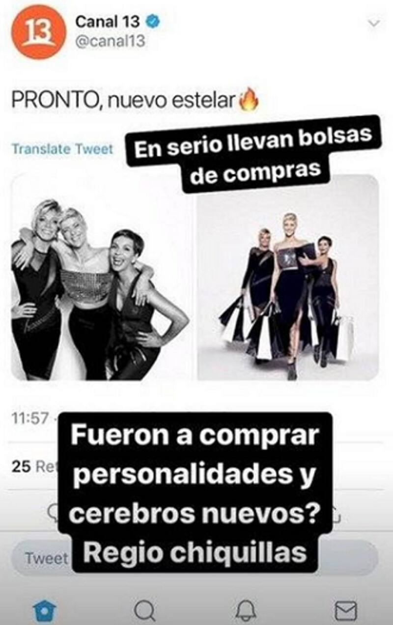 Todo comenzó cuando la voz en off de la "Divina Comida" subió una historia a su Instagram donde se burlaba del nuevo estelar de Canal 13, que estará bajo la conducción de Raquel Argandoña, Tonka Tomicic y Fran García-Huidobro.