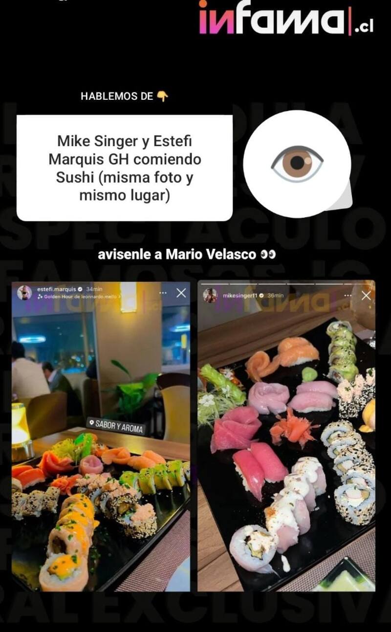 La página de Instagram Infama compartió la historia que subió Estefanía en su cuenta, junto a lo que compartió el joven publicista Michael Singer, más conocido en las redes como Mike Singer. Ambos disfrutaron de una noche de sushi en un reconocido restaurante de la zona oriente de la capital.