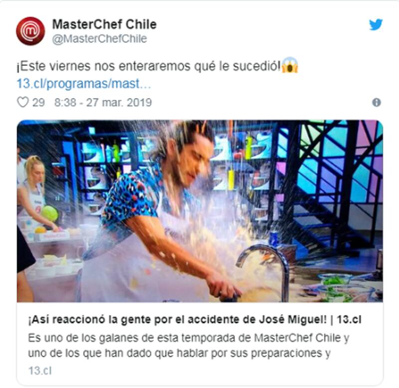Este capítulo es el octavo del reality de cocina, el cual se emitirá este viernes, día en que se podrá ver lo que pasó con José Miguel. El programa subió la noticia en sus redes, por lo que se presume que nada grave ocurrió.