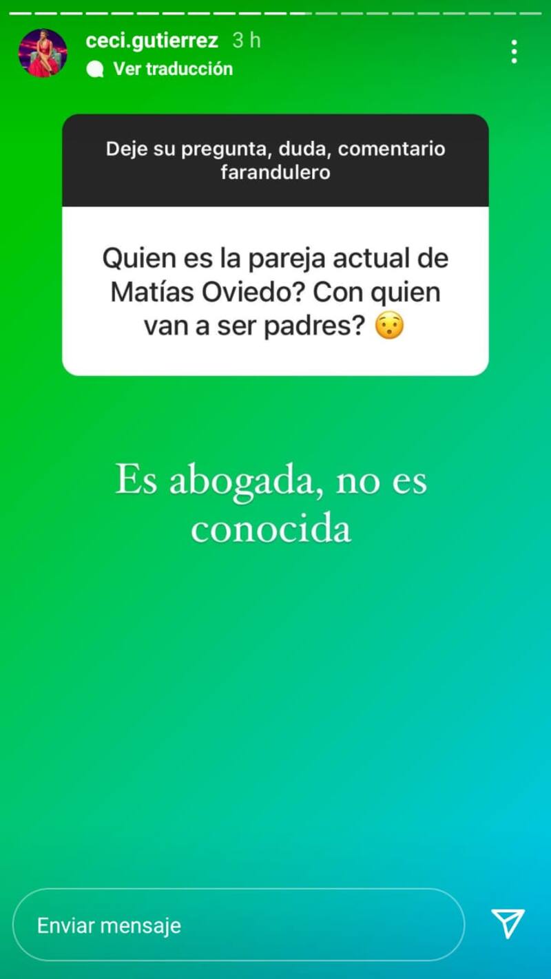 Minutos después, le consultaron quién sería la madre del hijo del actor. "¿Quién es la pareja actual de Matías Oviedo? Con quién van a ser padres?", le consultaron, a lo que respondió revelando que es una joven abogada que no tiene nada que ver con el mundo de la televisión.