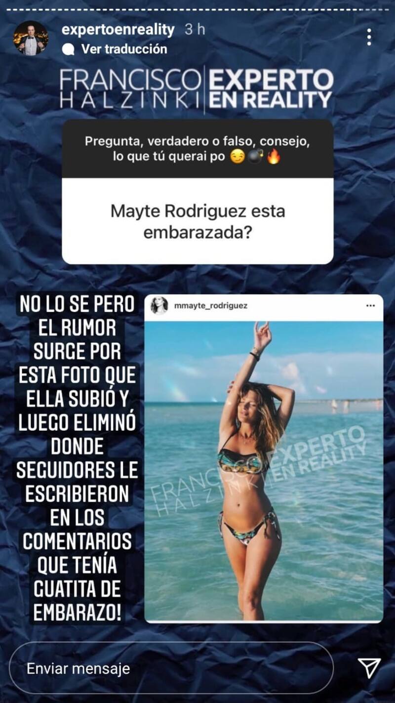 "¿Mayte Rodríguez está embarazada?", le preguntaron a Halzinki quien respondió "No lo sé, pero el rumor surge por esta foto que ella subió y luego eliminó, donde seguidores le escribieron en los comentarios que tenía guatita de embarazo", detalló, revelando el registro.