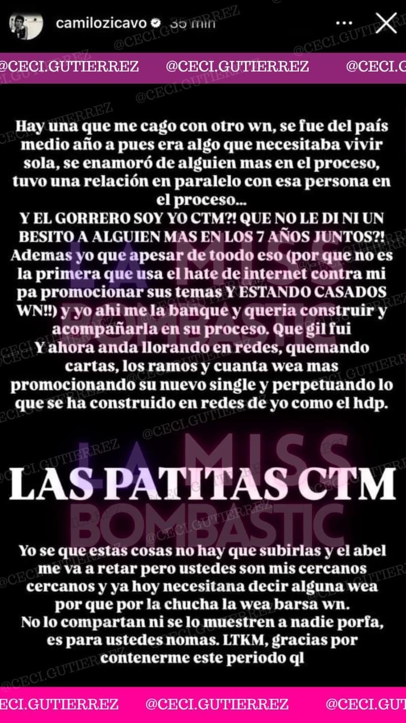 “Qué gil fui. Y ahora anda llorando en redes, quemando cartas, los ramos y cuanta hueá más, promocionando su nuevo single y perpetuando lo que se ha construido en redes, de yo como el hdp. ¡Las patitas CTM!”, agregó.