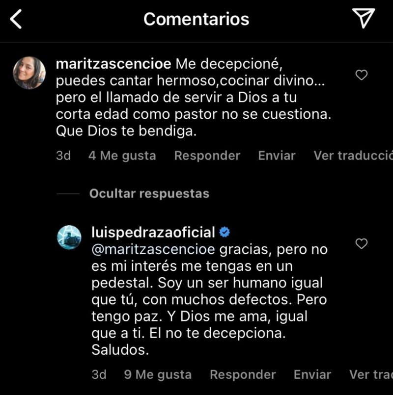 Pedraza entonces no dejó pasar la crítica y respondió honestamente al cuestionamiento. “Gracias, pero no es mi interés que me tengas en un pedestal. Soy un ser humano igual que tú, con muchos defectos. Pero tengo paz. Y Dios me ama, igual que a ti. El no te decepciona”, contestó el cantante.