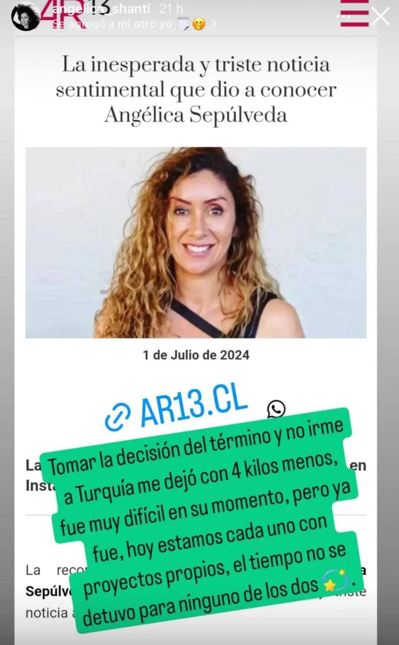 Posteriormente, Angélica subió otra historia en la que se sinceró con sus seguidores y confesó algunas de las consecuencias que enfrentó tras el quiebre.