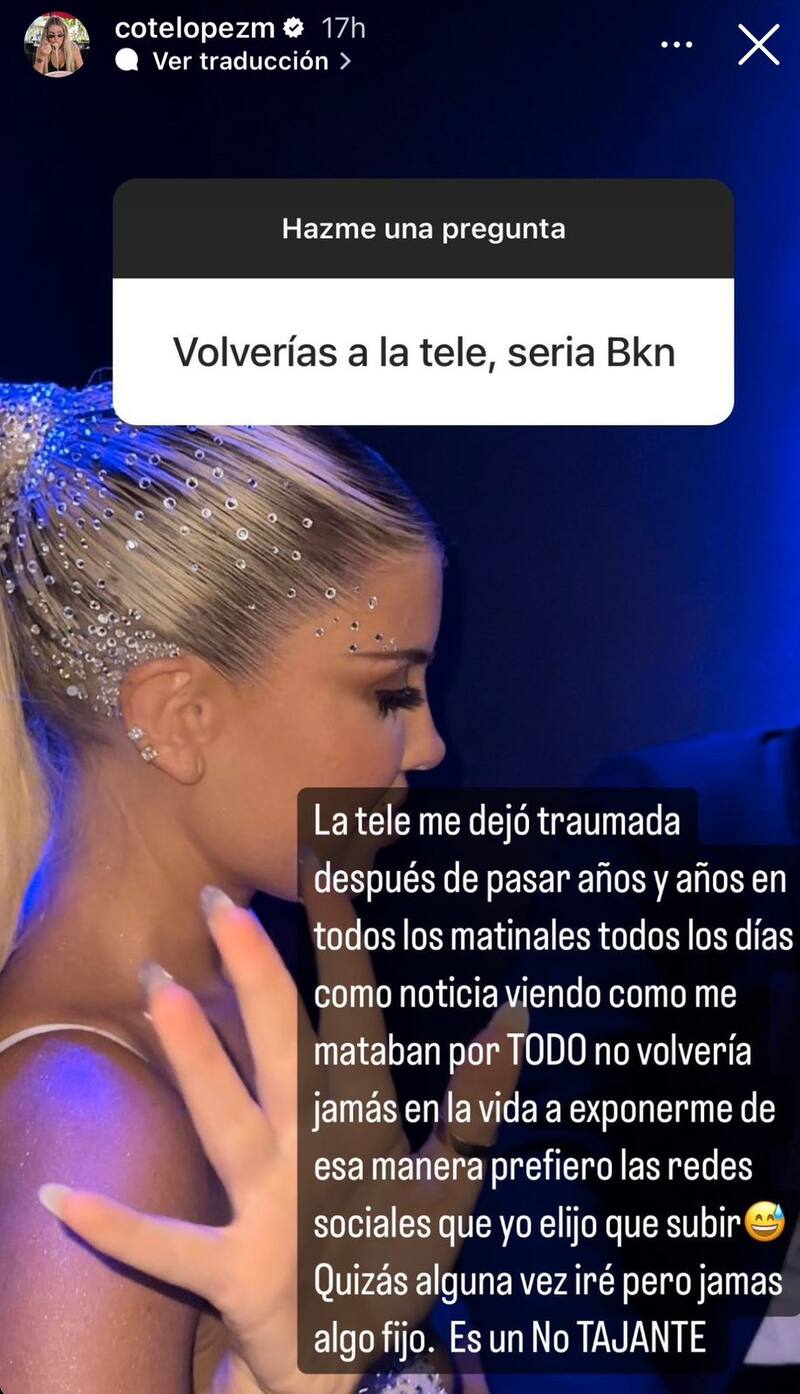 Y sobre la misma, aclaró: “no volvería jamás en la vida a exponerme de esa manera, prefiero las redes sociales (donde) yo elijo qué subir”.